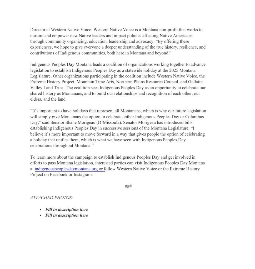 Northern Plains is proud to participate in a coalition of organizations working together to advance legislation to establish Indigenous Peoples Day as a statewide holiday at the 2025 Montana Legislature. Led by Indigenous Peoples Day Montana (https://northernplainsresourcecouncil.cmail20.com/t/j-l-gdkdhkd-ikgtuqx-k/), the coalition also includes Western Native Voice (https://northernplainsresourcecouncil.cmail20.com/t/j-l-gdkdhkd-ikgtuqx-u/), The Extreme History Project (https://northernplainsresourcecouncil.cmail20.com/t/j-l-gdkdhkd-ikgtuqx-o/), Mountain Time Arts (https://northernplainsresourcecouncil.cmail20.com/t/j-l-gdkdhkd-ikgtuqx-m/)