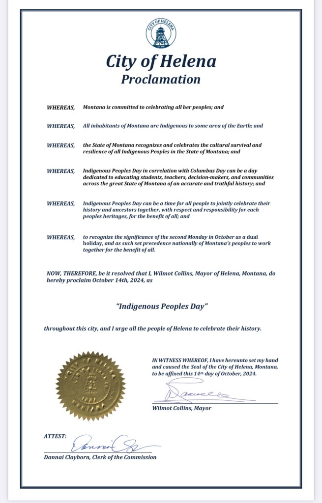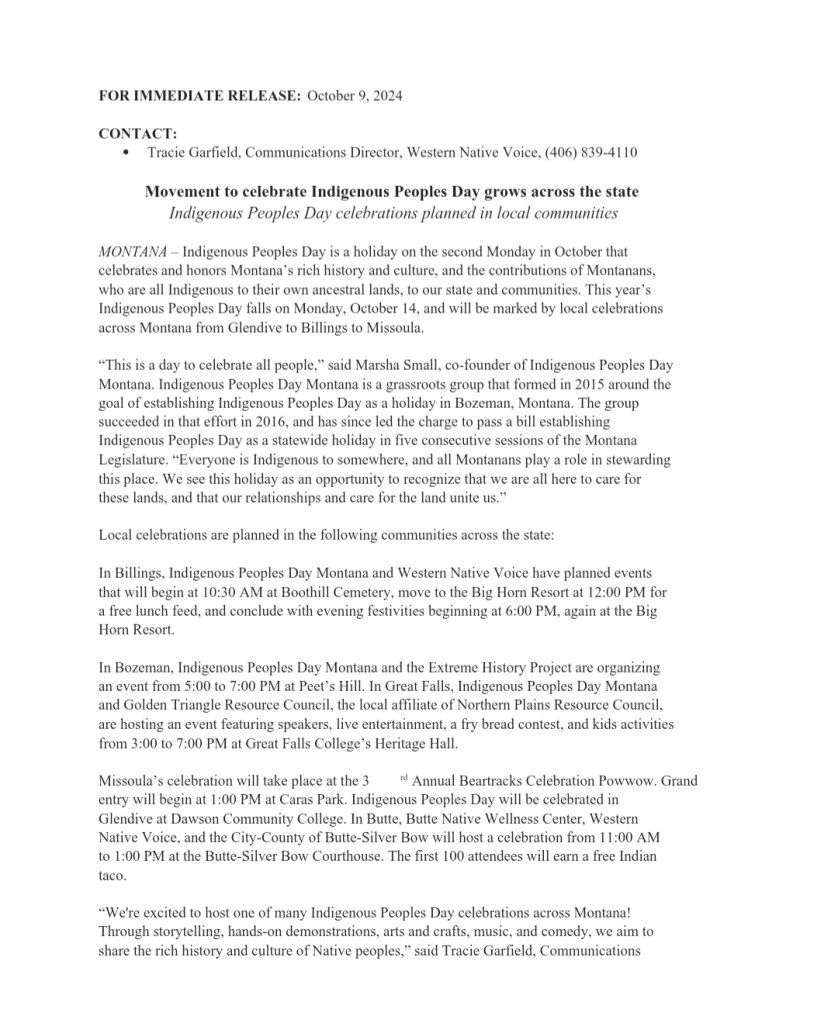 “It’s important to have holidays that represent all Montanans, which is why our future legislation will simply give Montanans the option to celebrate either Indigenous Peoples Day or Columbus Day,” said Senator Shane Morigeau. Senator Morigeau has introduced bills establishing Indigenous Peoples Day in successive sessions of the Montana Legislature. “I believe it’s more important to move forward in a way that gives people the option of celebrating a holiday that unifies them, which is what we have seen with Indigenous Peoples Day celebrations throughout Montana.”