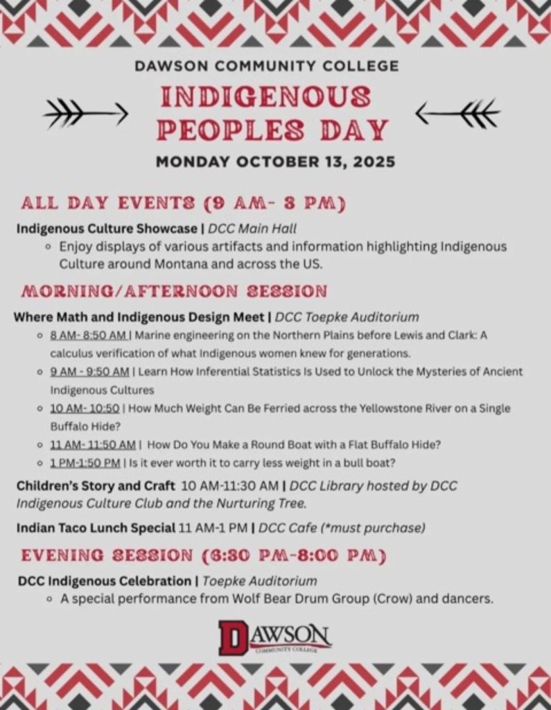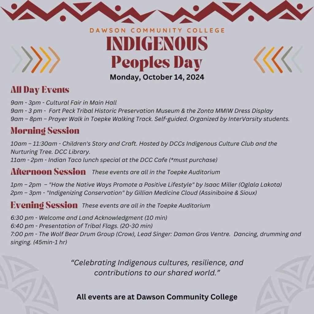 • Glendive (https://northernplainsresourcecouncil.cmail20.com/t/j-l-gdkdhkd-ikgtuqx-d/): Dawson Community College is hosting their 5th annual Indigenous Peoples Day celebration with a full day of events beginning at 9 AM.