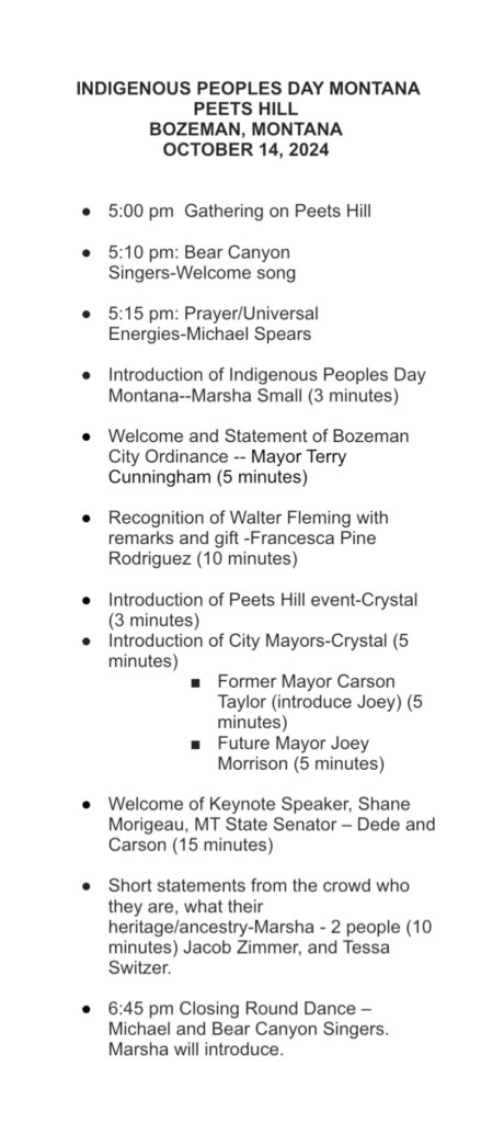“This is a day to celebrate all people,” said Marsha Small, co-founder of Indigenous Peoples Day Montana. Indigenous Peoples Day Montana is a grassroots group that formed in 2015 around the goal of establishing Indigenous Peoples Day as a holiday in Bozeman, Montana. The group succeeded in that effort in 2016 and has since led the charge to pass a bill establishing Indigenous Peoples Day as a statewide holiday in five consecutive sessions of the Montana Legislature. “Everyone is Indigenous to somewhere, and all Montanans play a role in stewarding this place. We see this holiday as an opportunity to recognize that we are all here to care for these lands, and that our relationships and care for the land unite us.”
