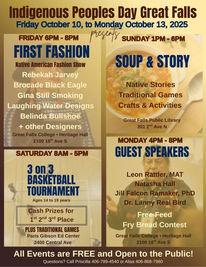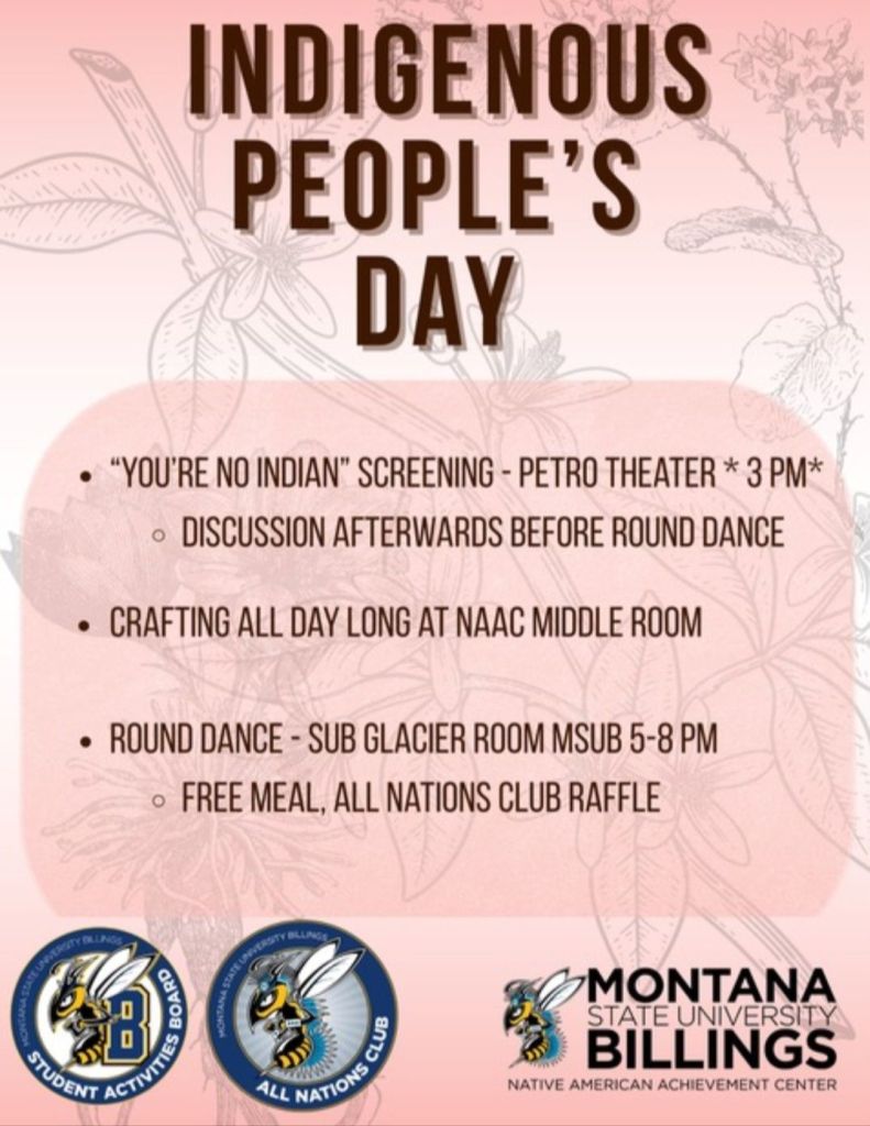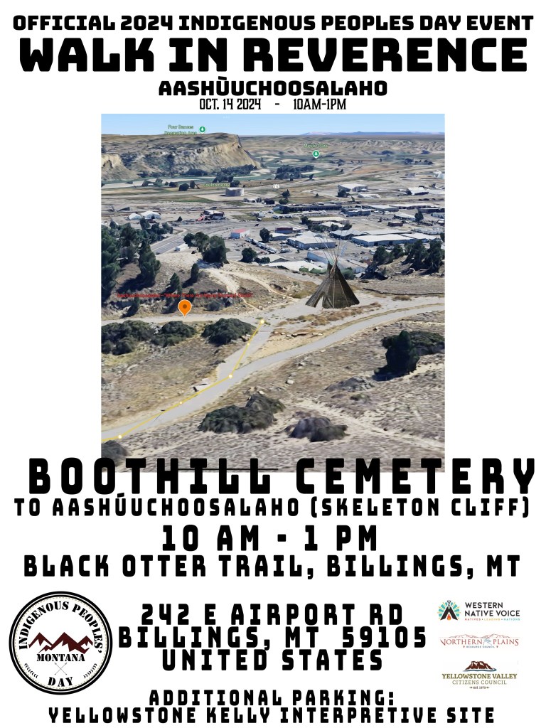 • Billings (https://northernplainsresourcecouncil.cmail20.com/t/j-l-gdkdhkd-ikgtuqx-y/): Indigenous Peoples Day Montana and Western Native Voice have planned events that will begin at 10:00 AM at Boothill Cemetery, move to the Big Horn Resort at 12:00 PM for a free lunch feed, and conclude with evening festivities at 6:00 PM at the Big Horn Resort.