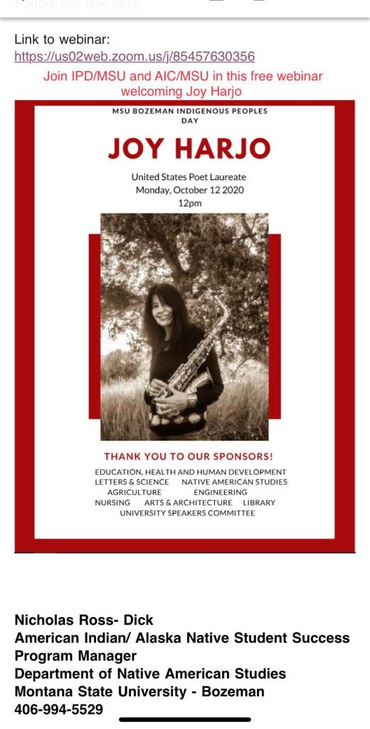 Free webinar! #JoyHarjo #PoetLaureate #USA #IndigenousPeoplesDayMontana #AmericanIndianCouncil #NativeAmericanStudies #MontanaStateUniversity